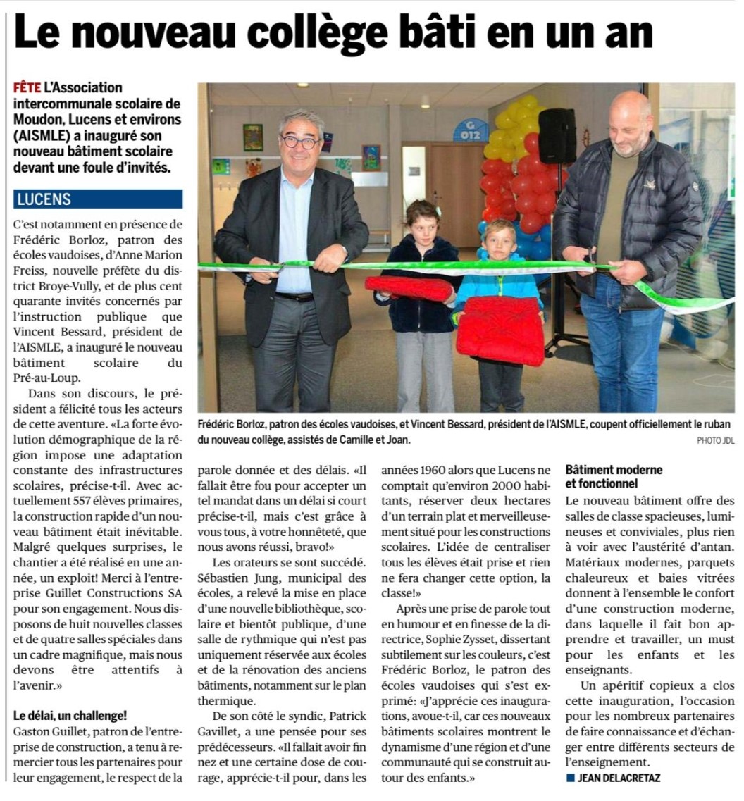 Ce vendredi 4 octobre, date de l’inauguration, Monsieur Borloz, chef du département de l’enseignement et de la formation professionnelle a débuté ce moment en coupant le ruban ! Plusieurs discours se sont ensuite enchainés rappelant les débuts de l’école de Lucens, les différentes décisions qui ont dû être prises ainsi que les aléas de la construction. Des discours percutants menés par plusieurs plusieurs personnalités de la commune et de l’AISMLE, le directeur de l’entreprise Guillet, ainsi par Madame Zysset la directrice de l’établissement et Monsieur Borloz. Une partie musicale menée par Monsieur François Intriere enseignant de musique, et plusieurs élèves de 8P a sublimé ce moment officiel. Un beau moment d’émotions !