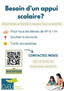 Le Service d’Aide à la Scolarité (SAS) offre des appuis scolaires individualisés pour les élèves de la 4P à la 11e année. En cas de difficulté financière, les familles au bénéfice d’une aide social (RI, PC Familles etc. ) sont en principe subventionnés par le service concerné.